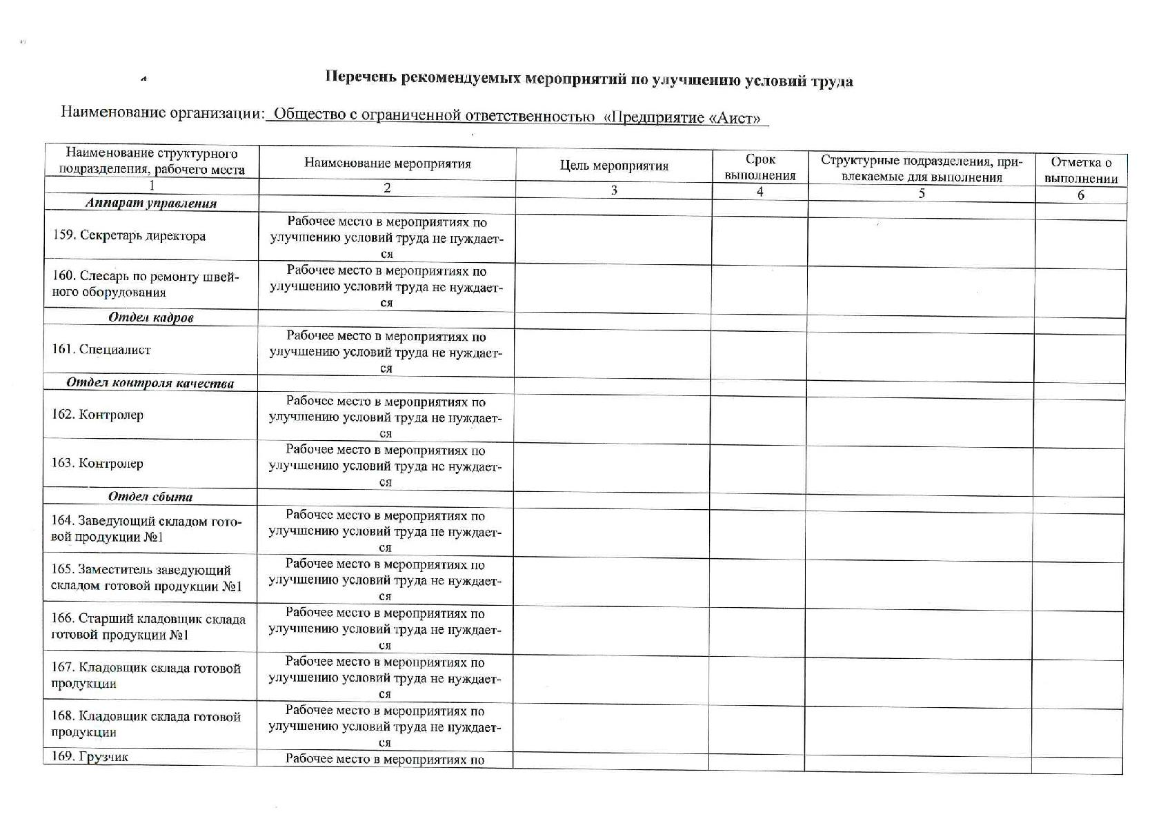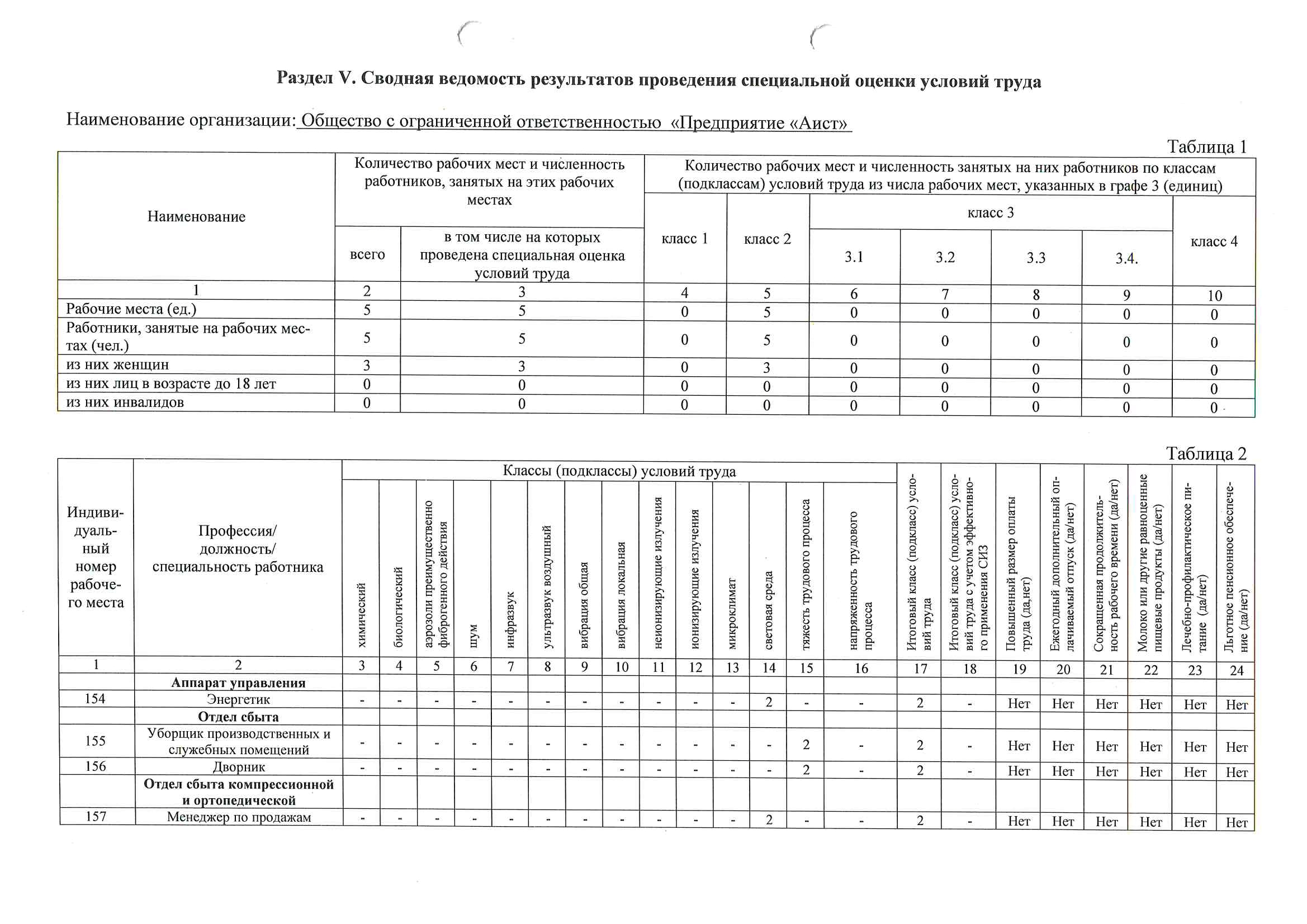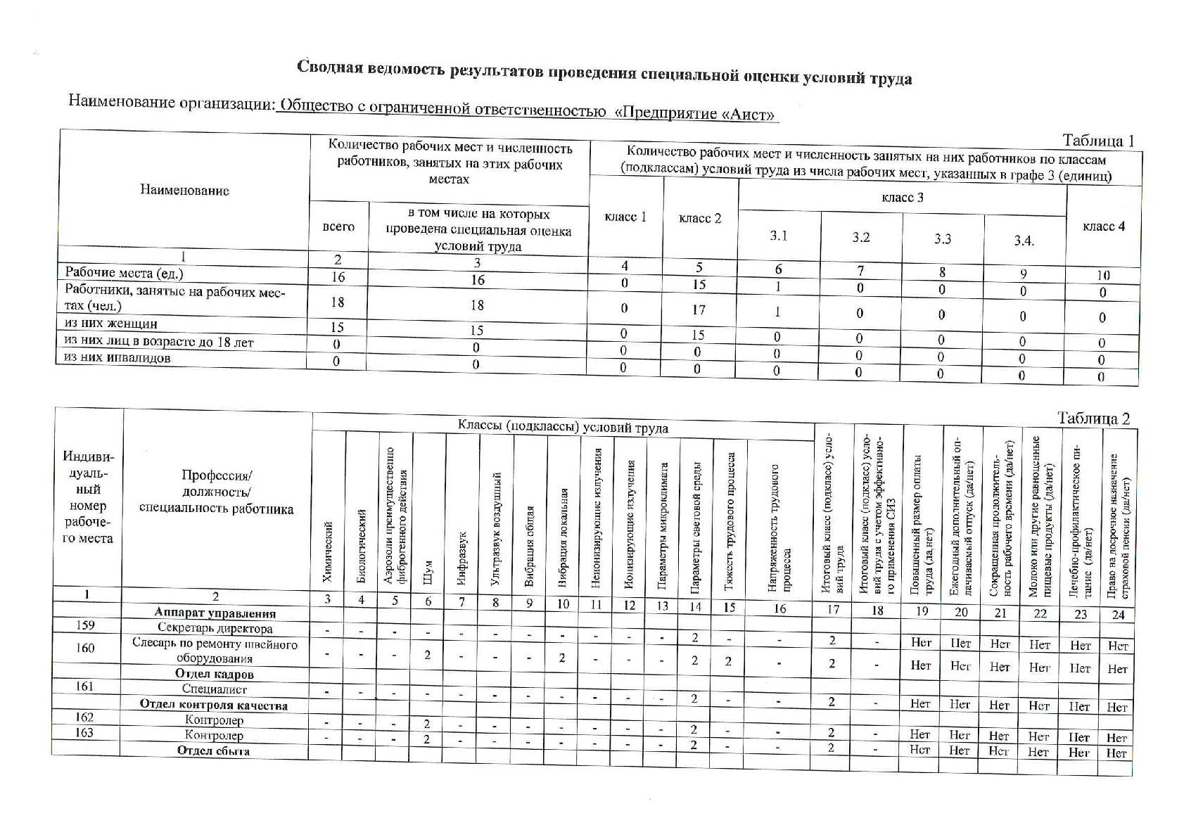 Сводная ведомость результатов проведения специальной оценки условий труда ООО «Предприятие «Аист»