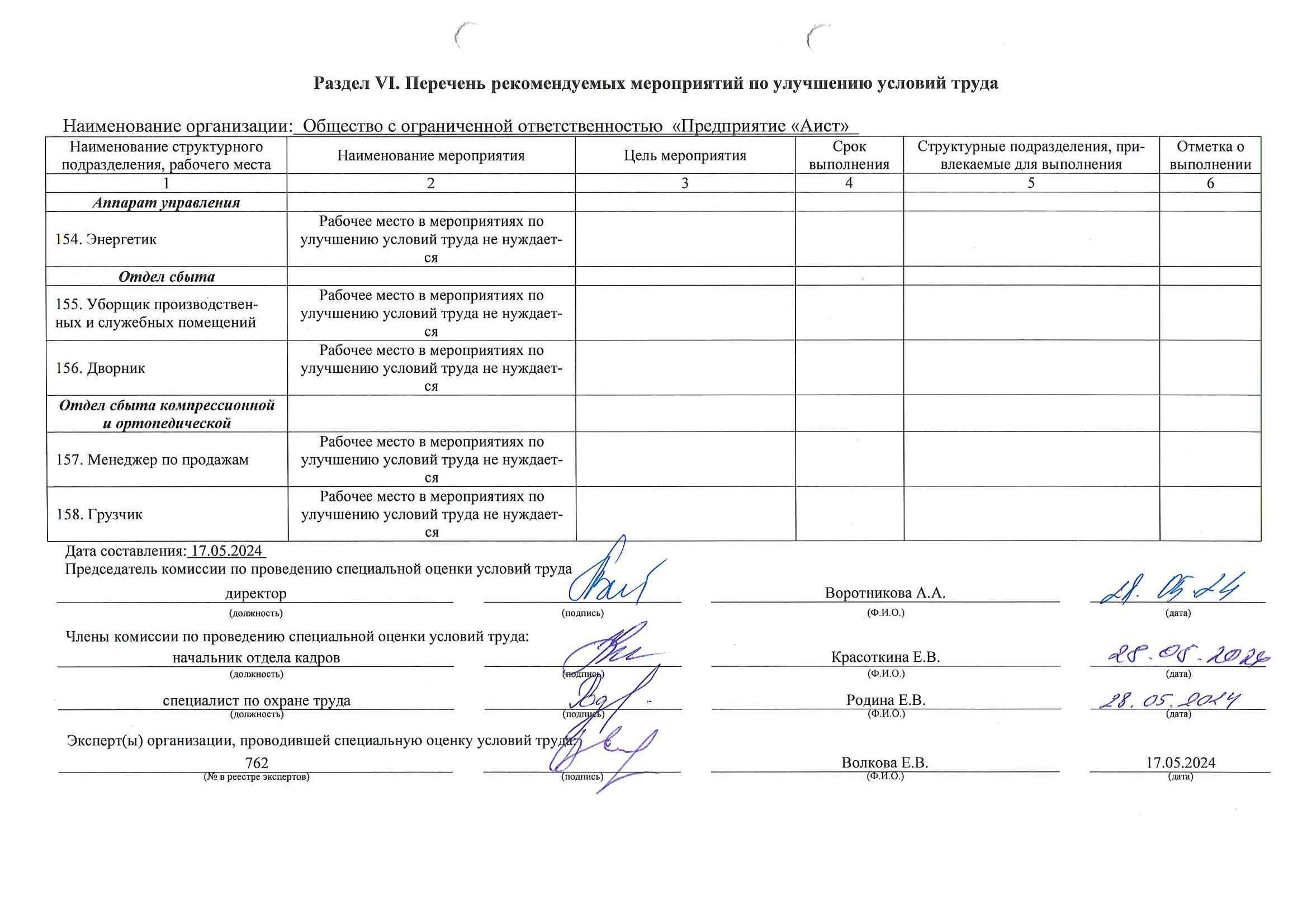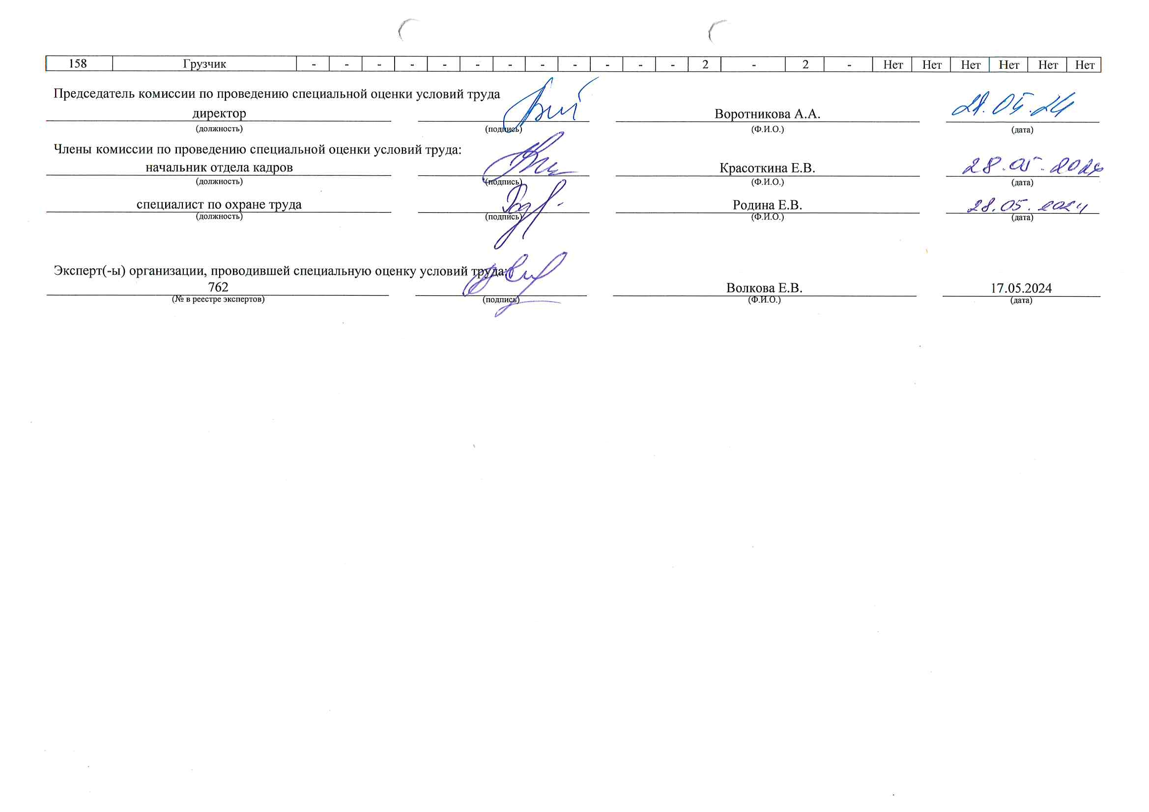 Сводная ведомость результатов проведения специальной оценки условий труда 28.05.2024