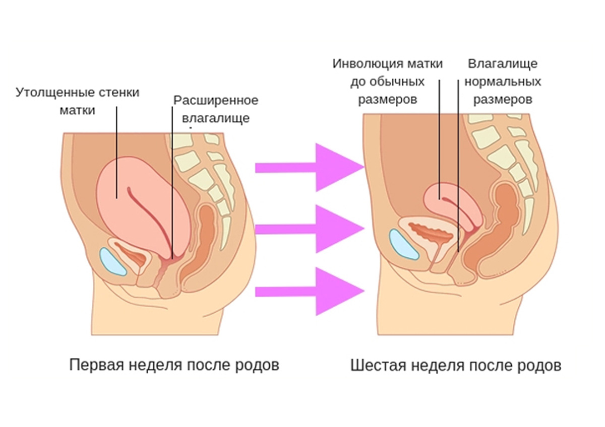 Сразу после рождения плаценты и плодных оболочек (последа) матка начинает сильно сокращаться, и уже через несколько минут приобретает круглую форму размером с большой грейпфрут. Дно (то есть верхняя часть) матки достаёт примерно до пупка. За шесть последующих недель она будет уменьшаться и вернётся в итоге к своим первоначальным, добеременным размерам. Сокращения матки бывают весьма болезненными, особенно если роды не первые.