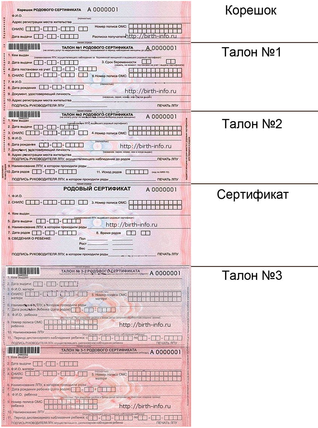 Талона №3, предназначенного для районной детской поликлиники (к которой прикрепляется после рождения и проходит диспансерное наблюдение на первом году жизни ребёнок) и состоящего из двух частей: талона №3-1 – эта часть идёт в поликлинику, в которой ведётся наблюдение за новорожденным в первые пол года его жизни; и №3-2 – эту часть забирает поликлиника, осуществлявшая наблюдение за ребёнком в период с 6 и до 12 месяцев.
