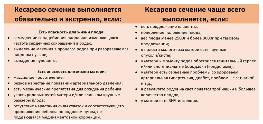 Операция кесарева сечения может быть экстренной и плановой. Экстренное кесарево производится во время родов, которые по какой-то причине не развиваются, или если в их процессе выявлена опасность для жизни матери или плода. Плановая операция намечается заранее, обычно уже в начале или середине беременности становится известно об её необходимости.