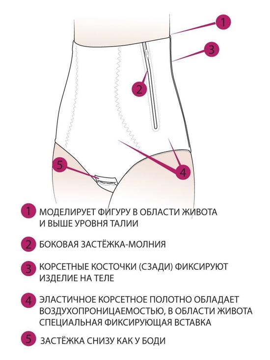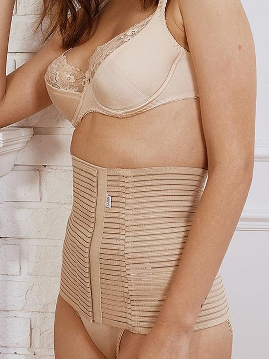 Бандаж способствует быстрому восстановлению тонуса мышц и кожи живота. При отсутствии противопоказаний можно носить с первого дня после родов и до полного восстановления формы живота. Бандаж для похудения с корсетными косточками и боковой застёжкой на молнии моделирует фигуру выше уровня талии. Застежка, как у боди, позволяет не снимать бандаж при необходимости. Модель обладает компрессионным эффектом.